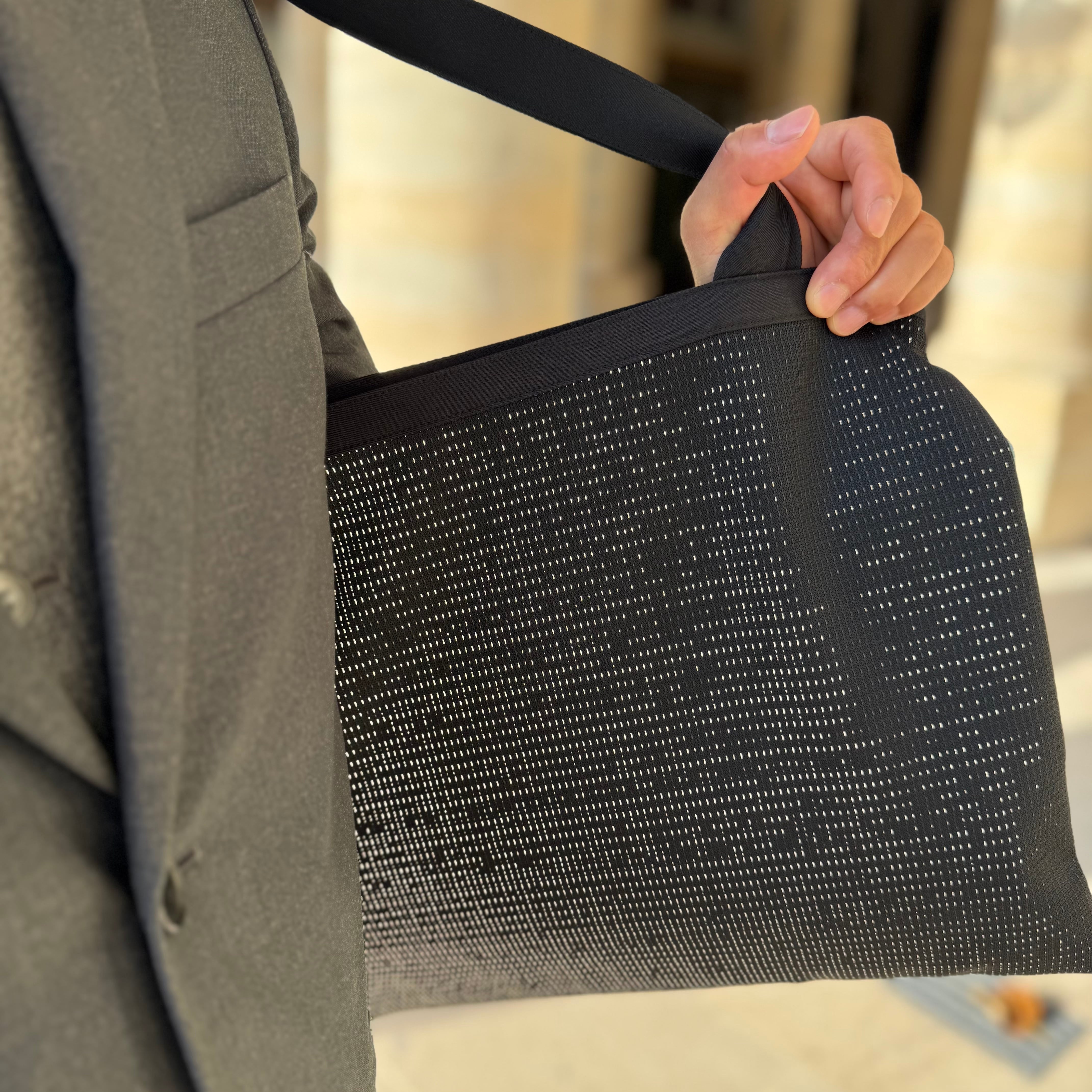 ベースの生地は、日本有数のテキスタイルの産地、群馬県桐生市で「光を編む」をコンセプトに開発されたラメニット「TRICOLUM(トリコリュム)」を使用しています。光と角度で変わるキラキラした表情が特徴です。